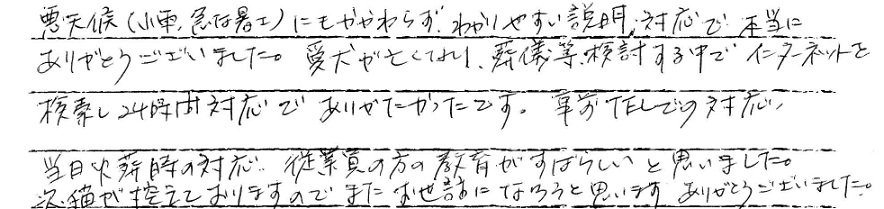 24時間対応でありがたかったです。事前TELでの対応