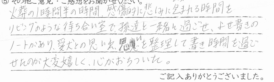 火葬の1時間半の間、感傷的に悲しみに包まれる時間をリビングのような待ち合い室で、孫達と一緒に過ごせ、よせ書きのノートがあり、愛犬との思い出、思いを整理して書き時間を過ごせたのが大変嬉しく、心がおちついた。 当社スタッフより