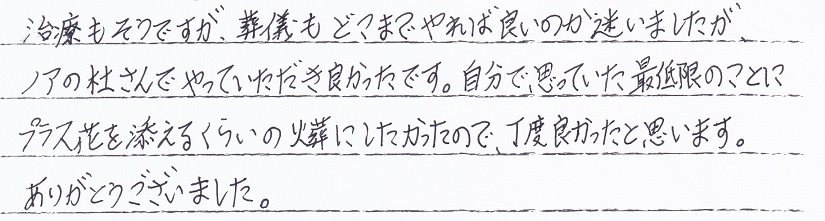 治療もそうですが、葬儀もどこまでやれば良いのか迷いましたが、ノアの杜さんでやっていただき良かったです。自分で思っていた最低限のことにプラス花を添えるくらいの火葬にしたかったので、丁度良かったと思います。ありがとうございました。 当社スタッフより