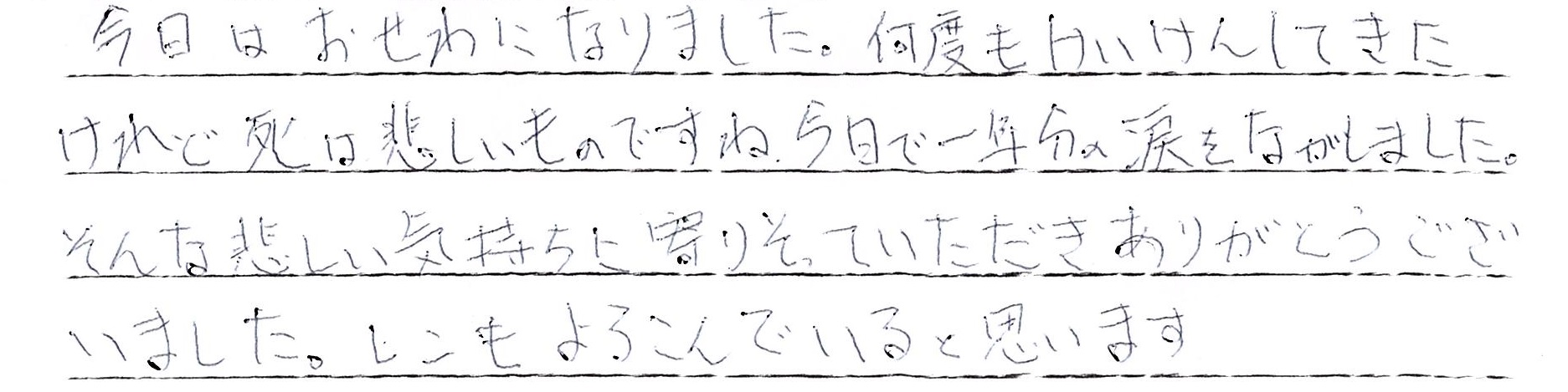 今日はおせわになりました。何度もけいけんしてきた けれど、死は悲しいものですね。今日で1年分の涙をながしました。 そんな悲しい気持ちに寄りそっていただきありがとうございました レンもよろこんでいると思います 当社スタッフより