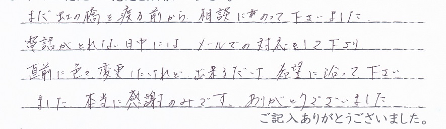 まだ虹の橋を渡る前から相談にのって下さいました。電話がとれない日中にはメールでの対応をして下さり直前に色々変更にしたけれど出来るだけ希望に沿って下さいました。本当に感謝のみです。ありがとうございました。