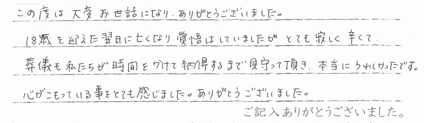 この度は大変お世話になり、ありがとうございました。18歳を迎えた翌日に亡くなり覚悟はしていましたがとても寂しく辛くて、葬儀も私たちが時間をかけて納得するまで見守って頂き、本当にうれしかったです。心がこもっている事をとても感じました。ありがとうございました。 当社スタッフより