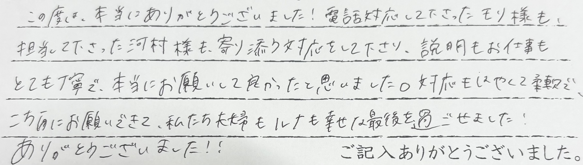 この度は、本当にありがとうございました!電話対応して下さったモリ様も担当して下さった河村様も寄り添う対応をして下さり、説明もお仕事もとても丁寧で、本当にお願いして良かったと思いました。対応も早くて柔軟で、こちらにお願いできて私たち夫婦もルナも幸せな最後を過ごせました。 当社スタッフより