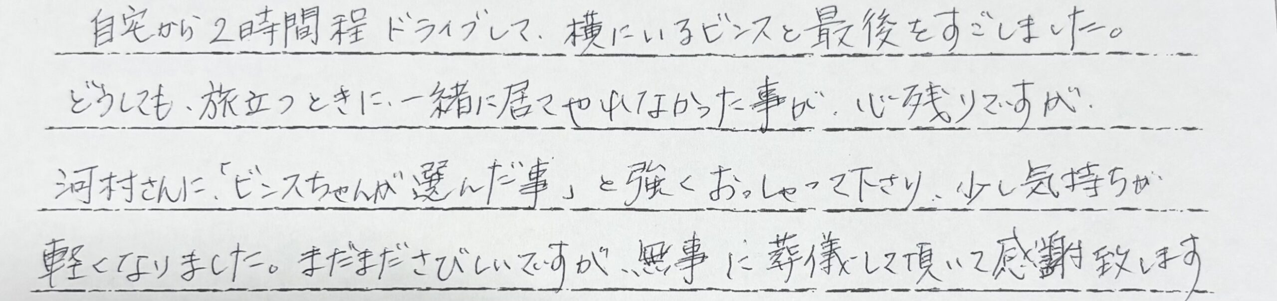 自宅から2時間程ドライブして横にいるビンスと最後をすごしました。どうしても旅立つときに一緒に居てやれなかった事が心残りですが、河村さんに「ビンスちゃんが選んだ事」と強くおっしゃって下さり少し気持ちが軽くなりました。まだまださびしいですが無事に葬儀して頂いて感謝致します。 当社スタッフより