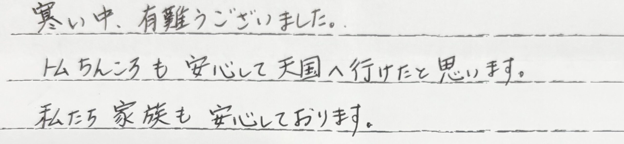 寒い中、有難うございました。トムちんころも安心して天国へ行けたと思います。私たち家族も安心しております。 当社スタッフより