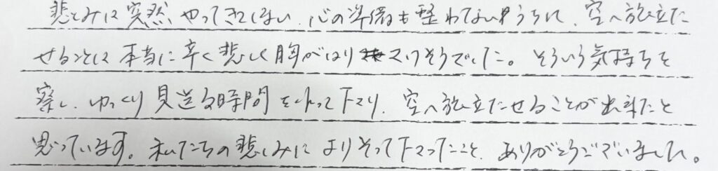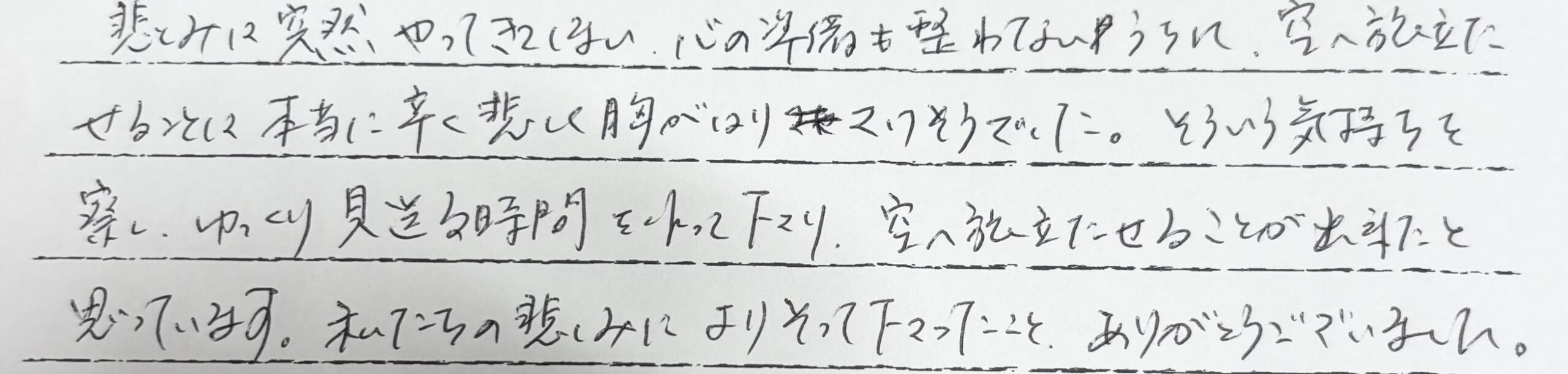 悲しみは突然やってきてしまい心の準備も整わないいうちに空へ旅立たせることは本当に悲しく胸がはりさけそうでした。そういう気持ちを察しゆっくり見送る時間を作ってくださり空へ旅立たせることが出来たと思っています。私たちの悲しみに寄り添って下さったことありがとうございました。 当社スタッフより