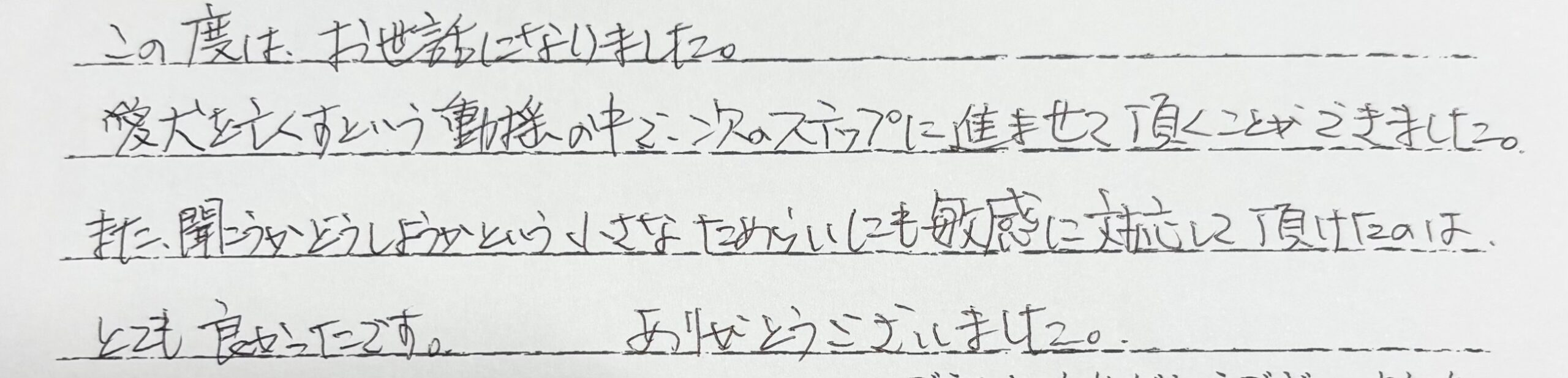 この度はお世話になりました。愛犬を亡くすという動揺の中で次のステップに進ませて頂くことができました。また、聞こうかどうしようかという小さなためらいにも敏感に対応して頂けたのはとても良かったです。ありがとうございました。 当社スタッフより