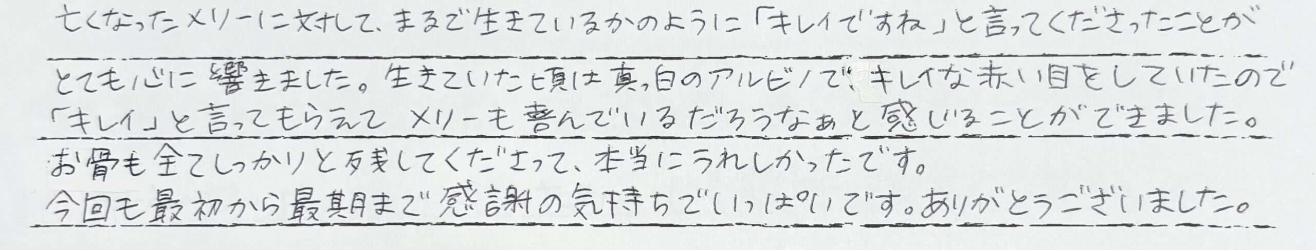 亡くなったメリーに対して、まるで生きているかのように「キレイですね」と言ってくださったことがとても心に響きました。生きていた頃は真っ白のアルビノでキレイな赤い目をしていたので「キレイ」と言ってもらえてメリーも喜んでいるだろうなぁと感じることができました。お骨も全てしっかりと残してくださって、本当にうれしかったです。今回も最初から最期まで感謝の気持ちでいっぱいです。ありがとうございました。 当社スタッフより