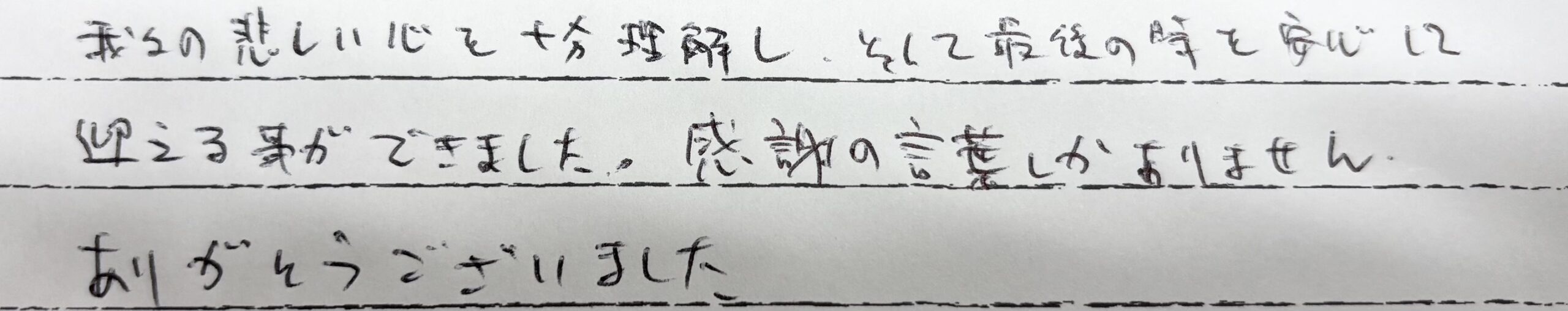 我々の悲しい心を十分理解しそして最後の時を安心して迎える事ができました。感謝の言葉しかありません。ありがとうございました。 当社スタッフより