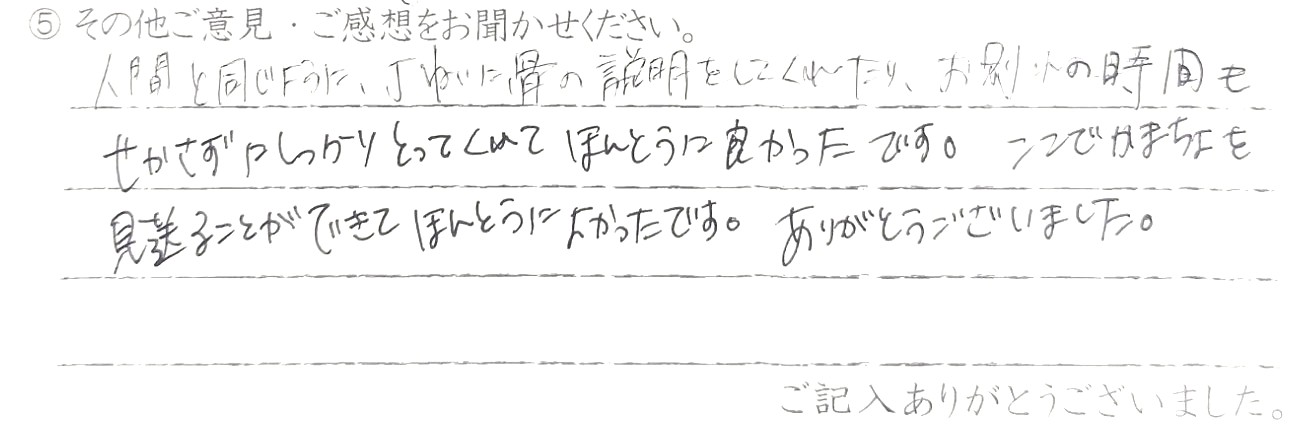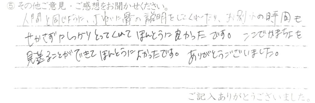 人間と同じように丁ねいに骨の説明をしてくれたりお別れの時間も急かさずしっかりとってくれてほんとうによかったです。ここでかまちょを見送ることができてほんとうによかったです。ありがとうございました。 当社スタッフより