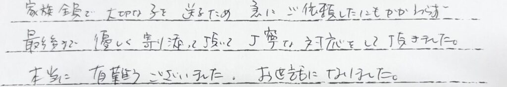 この度はノアの杜をご利用くださいましてありがとうございました。 ご家族皆様で送ってあげられることができましたね。