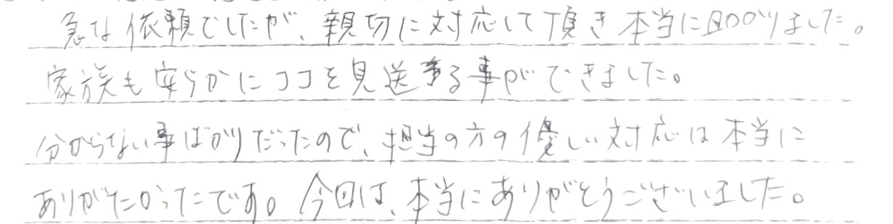 急な依頼でしたが親切に対応していただき本当に助かりました。家族も安らかにココを見送ることができました。わからないことばかりだったので担当の方の優しい対応は本当にありがたかったです。今回は本当にありがとうございました。 当社スタッフより
