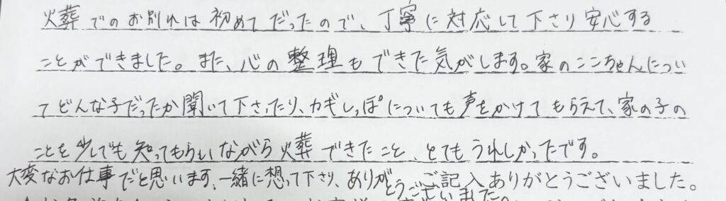 少しでもご家族様が安心してここちゃんとのお別れができたとのこと、私も安心致しました。