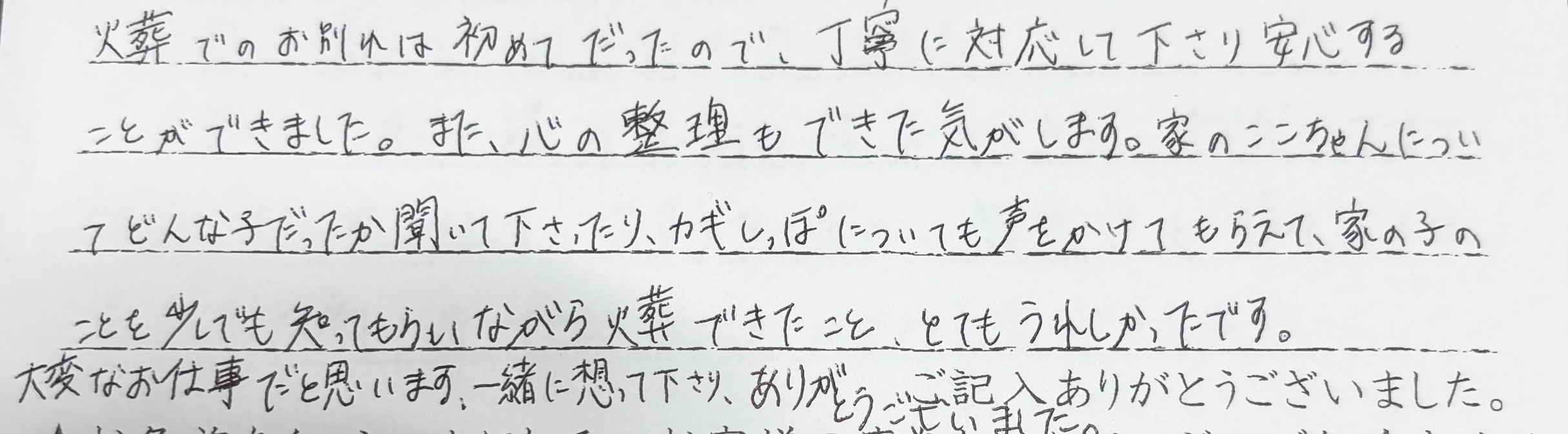 火葬でのお別れは初めてだったので、丁寧に対応して下さり安心することができました。また、心の整理もできた気がします。家のここちゃんについてどんな子だったのか聞いて下さったりカギしっぽについても声をかけてもらえて家の子のことを少しでも知ってもらいながら火葬できたこととても嬉しかったです。 当社スタッフより