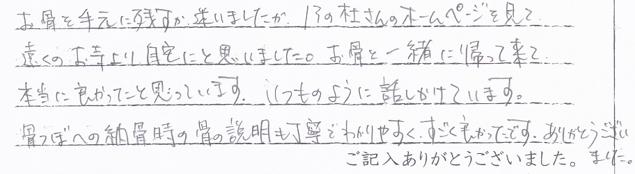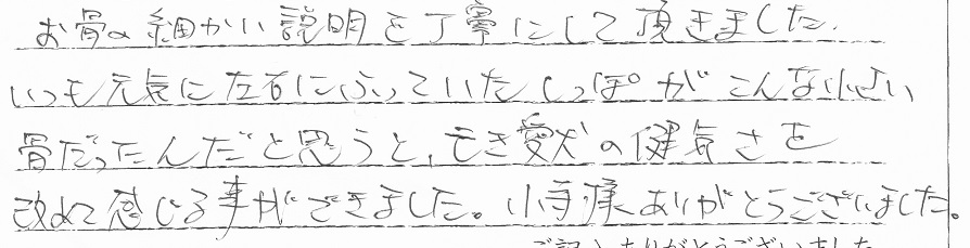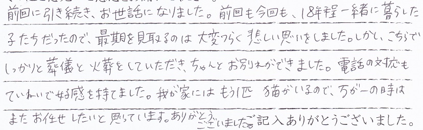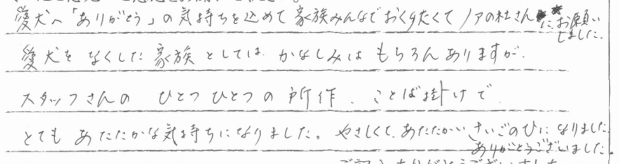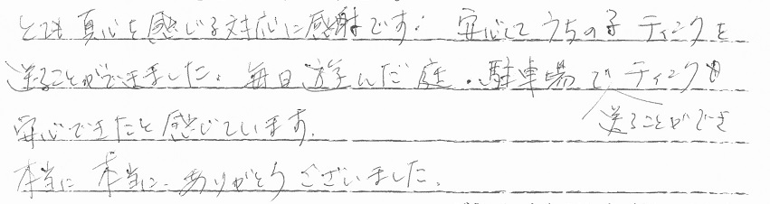 今回は家族みんなで押しかけましたが、大きな待合室でゆったりと快適に移管が経過しました。色々と配慮やペットに対する扱い・送迎の際のあいさつなどとてもキチンとされていて素晴しいです。お友達にも紹介しています。 当社スタッフより