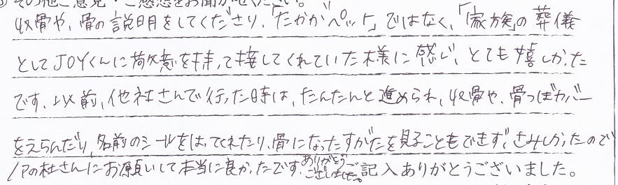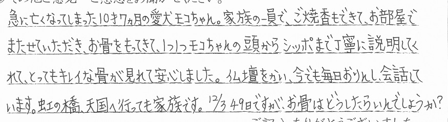 初めてのペット葬儀でしたが、とても丁寧な対応でお別れする事ができました。一つ一つの所作も美しく、とても好感が持てました。またメモリアルカプセル、写真立ても頂けて、自宅ですぐに飾ることができて、サービスも良かったです。この度は大変お世話になりました。ありがとうございました。 当社スタッフより