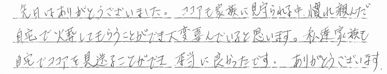 先日はありがとうございました。ココアも家族に見守られる中慣れ親しんだ自宅で火葬してもらうことができ大変喜んでいると思います。私達家族も自宅でココアを見送ることができ本当に良かったです。ありがとうございます。