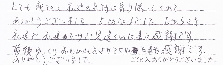 とても親切に私達の気持ちに寄り添ってくれてありがとうございました。大切な子でした だからこそ私達で私達だけで見送れた事に感謝です 最後ゆっくりおわかれをさせてくれた事も感謝です、ありがとうございました。