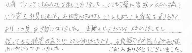 以前TVにてこちらのことは存じておりました。とても丁寧に家族の方々に接している姿を拝見してました。お世話になるならここにしよう!と社名を書きとめており、この度お世話になりました。金額もリーズナブルで助かりましたし 伺ってなら特典があったのでとてもうれしかったです。お電話での対応もよかったです。ありがとうございました。