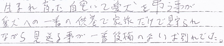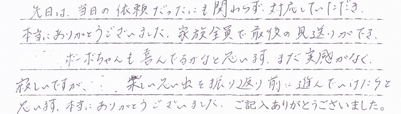 先日は、当日の依頼だったのにも関わらず対応していただき、本当にありがとうございました、家族全員で最後の見送りができ ボーボちゃんも喜んでいるかなと思います。まだ実感が無く、寂しいですが、楽しい思い出を振り返り前に進んでいけたらと思います。本当にありがとうございました。