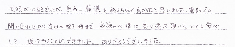 天候が心配でしたが、無事に葬儀を終えられて良かったと思いました。電話での問い合わせから当日の終了時まで 家族の心情に寄り添って頂いて、とても安心して送ってやることができました。ありがとうございました。
