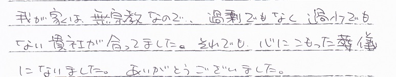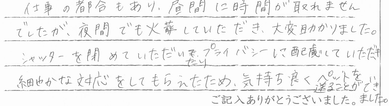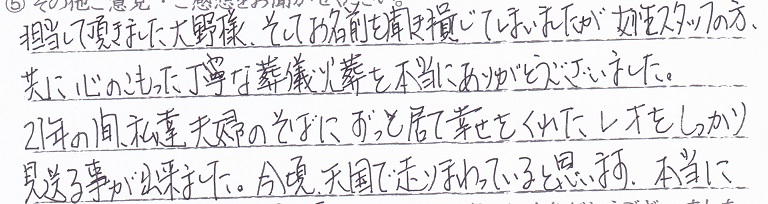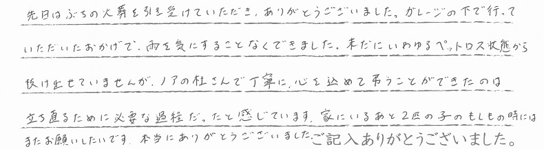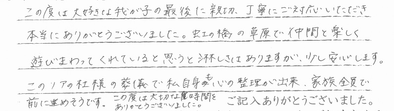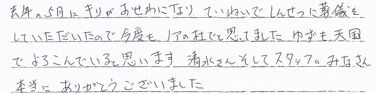 去年の5月にキリがおでわになり、ていねいでしんせつに葬儀をしていただいたので今後も、ノアの杜でと思ってました ゆずも天国でよろこんでいると思います 清水さんそしてスタッフのみなさん本当にありがとうございました。 当社スタッフより