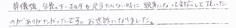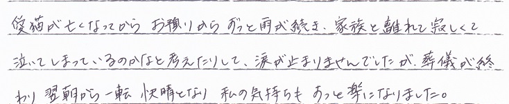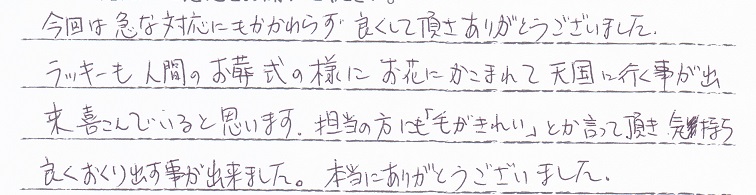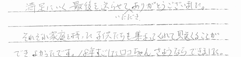 先日はお疲れ様でございました。ご家族様にあたたかく見守られ旅立てた事と思います。今頃はキリくんと一緒になって仲良く遊んでいる事と思います。