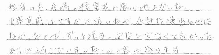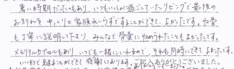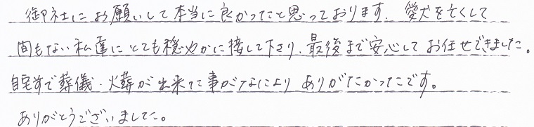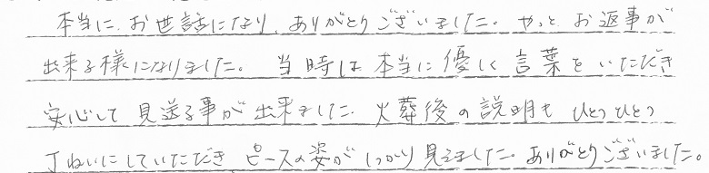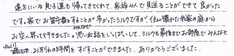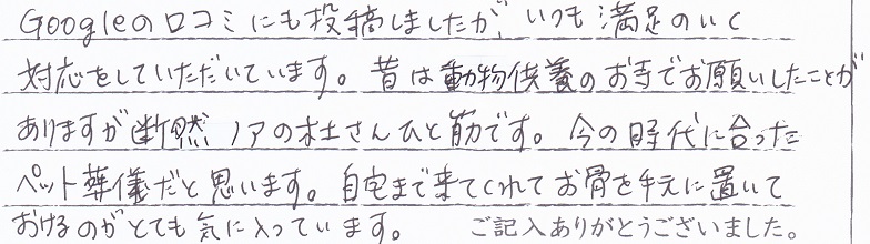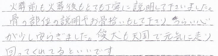 本当にお世話になり、ありがとうございました。やっとお返事が出来る様になりました。当時は本当に優しく言葉をいただき安心して見送る事が出来ました。火葬後の説明もひとつひとつ丁ねいにしていただき、ピースの姿がしっかり見えました。ありがとうございました。 当社スタッフより