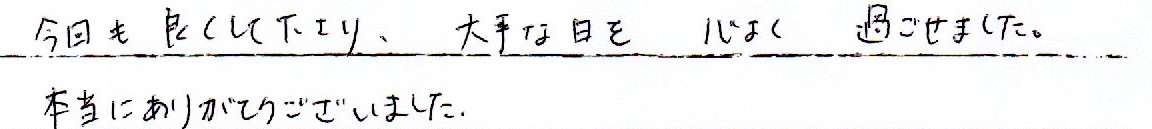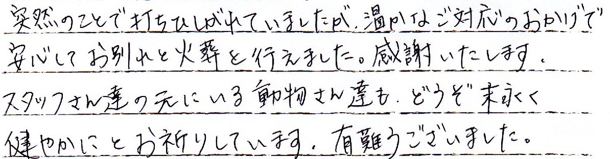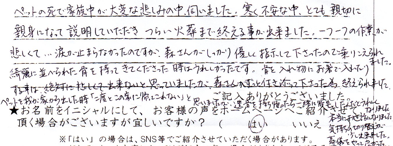 ていねいに火葬していただき、ありがとうございます。49日迄は自宅で供養して、その後はノアの杜さんの提携されてる本覚寺様に永代供養をしていただきたいと思っています。 当社スタッフより