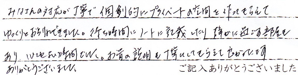 みなさんの対応が丁寧で個別的にプライベートの空間を作ってもらえてゆっくりとお別れできました。待ち時間にノートに記載したり静かに過ごす部屋もあり、心地よい時間でした。お骨の説明も丁寧にしてもらえて良かったです。ありがとうございました。 当社スタッフより