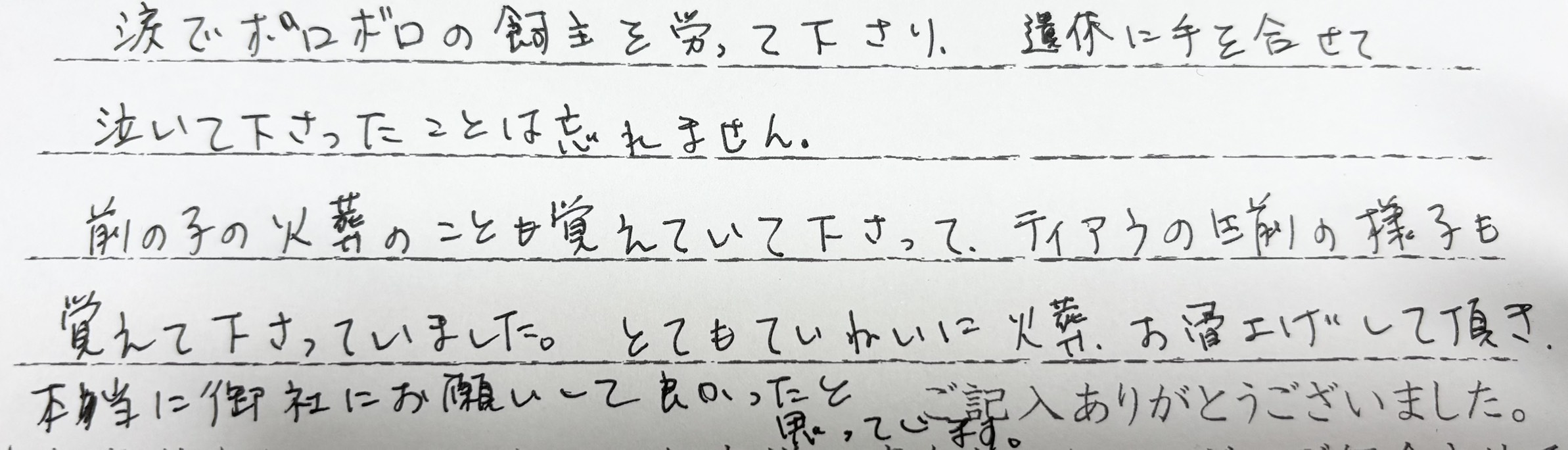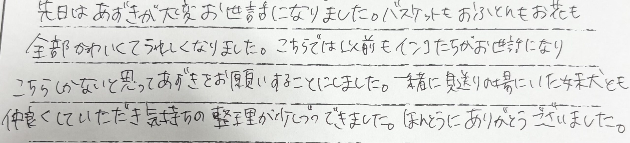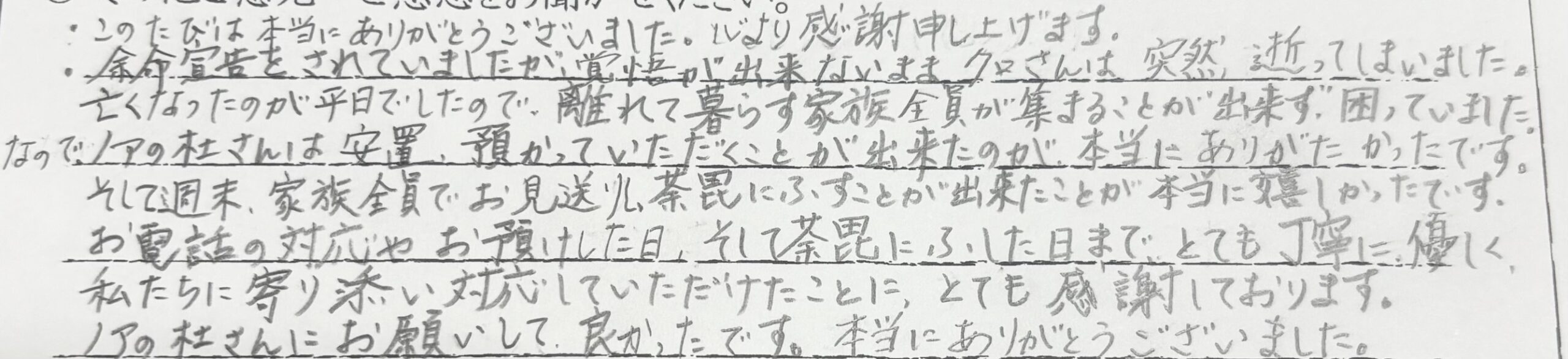 この度は本当にありがとうございました。心より感謝申し上げます。余命宣告をされていましたが覚悟が出来ないままクロさんは突然逝ってしましました。亡くなったのが平日でしたので離れて暮らす家族全員が集まることが出来ず困っていました。なのでノアの杜さんは安置、預かっていただくことが出来たのが本当にありがたかったです。そして週末、家族全員でお見送りし荼毘をふすことが出来たことが本当に嬉しかったです。お電話の対応やお預けした日、そして荼毘にふした日までとても丁寧に優しく私たちに寄り添い対応していただけたことにとても感謝しております。ノアの杜さんにお願いして良かったです。本当にありがとうございました。