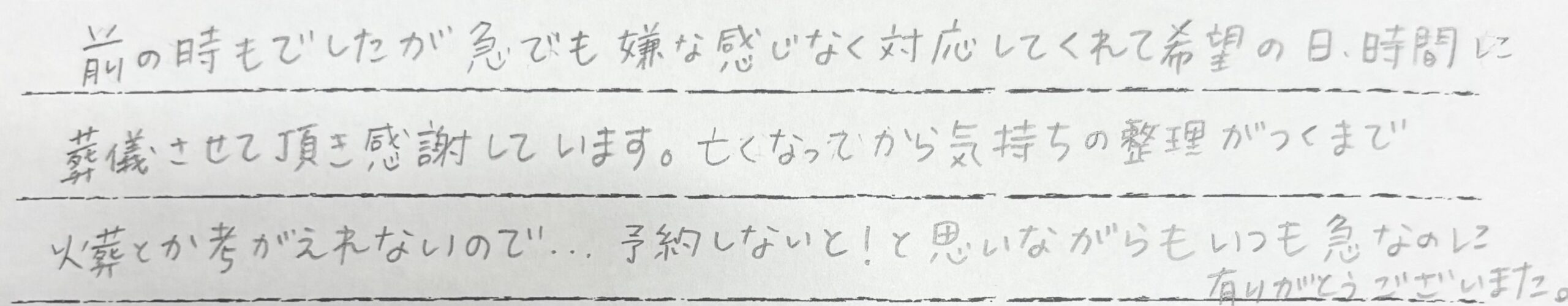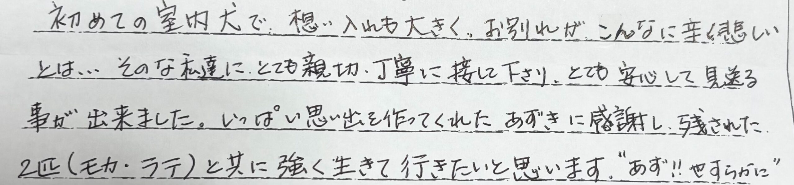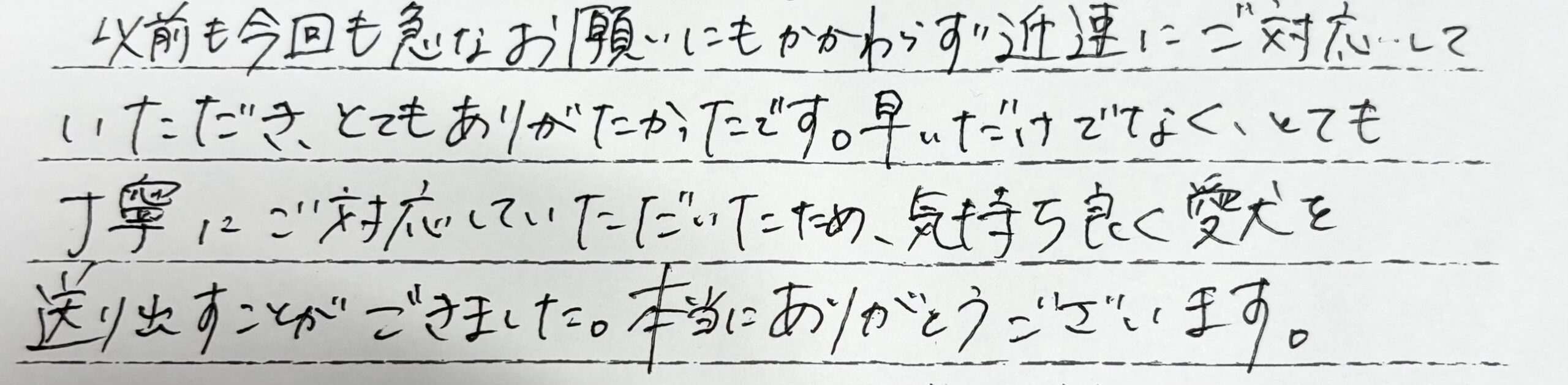 この度は本当にありがとうございました。心より感謝申し上げます。余命宣告をされていましたが覚悟が出来ないままクロさんは突然逝ってしましました。亡くなったのが平日でしたので離れて暮らす家族全員が集まることが出来ず困っていました。なのでノアの杜さんは安置、預かっていただくことが出来たのが本当にありがたかったです。そして週末、家族全員でお見送りし荼毘をふすことが出来たことが本当に嬉しかったです。お電話の対応やお預けした日、そして荼毘にふした日までとても丁寧に優しく私たちに寄り添い対応していただけたことにとても感謝しております。ノアの杜さんにお願いして良かったです。本当にありがとうございました。