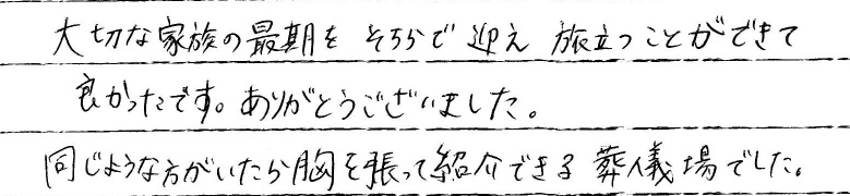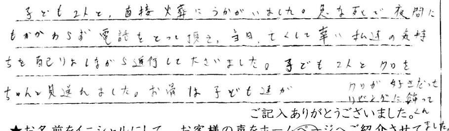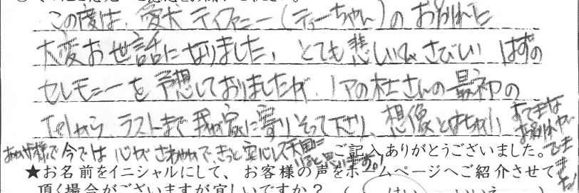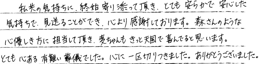本当に突然の電話にも関わらず、御親切に 御丁寧に、 接して下さり、家族一同感謝しています。ポンも大変喜んでいると 思います。もちろん初めての経験でしたが、安心してお任せ 出来ました。本当に本当にありがとうございました。 当社スタッフより