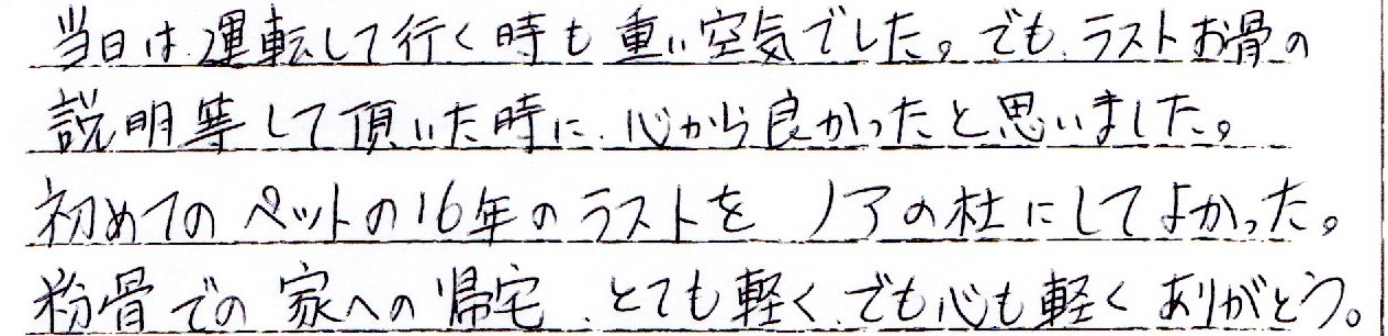当日は、運転して行く時も重い空気でした。でも、ラストお骨の説明等して頂いた時に、心から良かったと思いました。初めてのペットの16年のラストを ノアの杜にしてよかった。粉骨での家への帰宅、とても軽く、でも心も軽くありがとう。