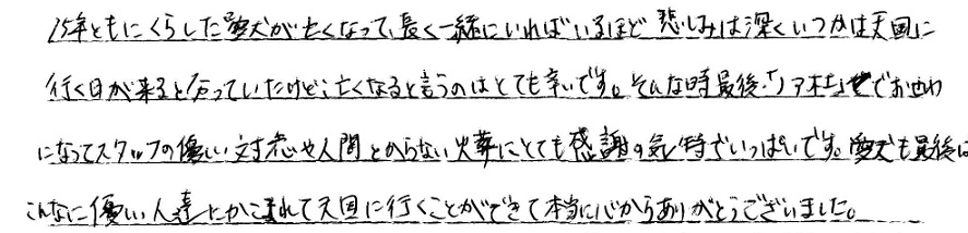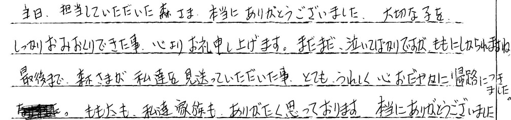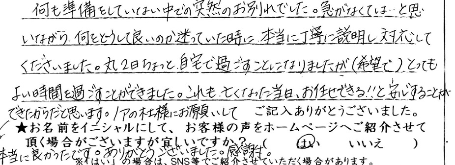 何も準備をしていない中での突然のお別れでした。急がなくては…と思いながら、何をどうして良いのか迷っていた時に、本当に丁寧に説明し対応してくださいました。丸2日ちょっと自宅で過ごすことになりましたが(希望で)とってもよい時間を過ごすことができました。これも、亡くなった当日、お任せできる!!と安心することができたからだと思います。ノアの杜様にお願いして本当に良かったです。ありがとうございました。感謝。