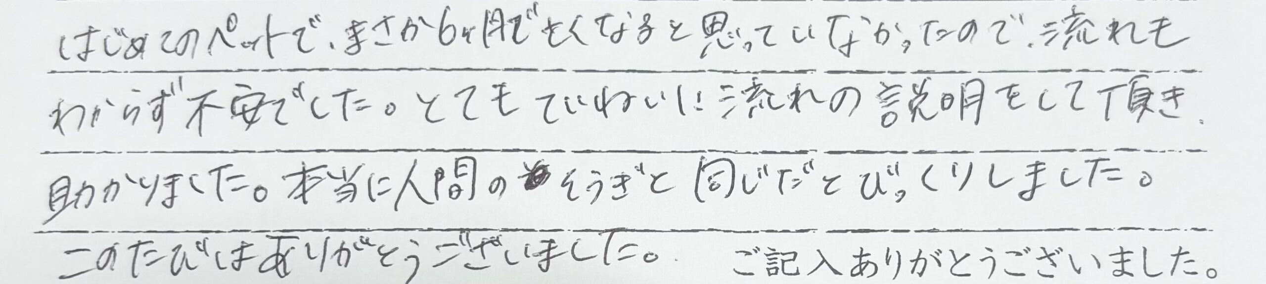 初めての室内犬で想い入れも大きく、お別れがこんなに辛く悲しいとは…そんな私達にとても親切・丁寧に接して下さりとても安心して見送ることが出来ました。いっぱい思い出を作ってくれたあずきに感謝し残された2匹(モカ・ラテ)と共に強く生きて行きたいと思います。”あず‼やすらかに” 当社スタッフより