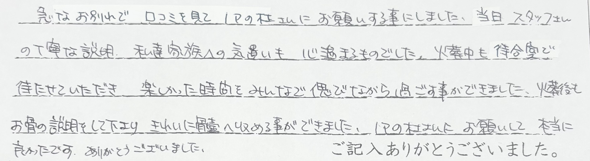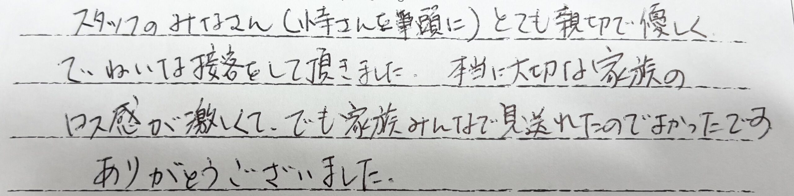 大切な家族を見送る事は、お心うちは計り知れないものと存じますが、まだまだお忙しいと思いますので、ご家族様もどうぞお身体ご自愛下さいませ。