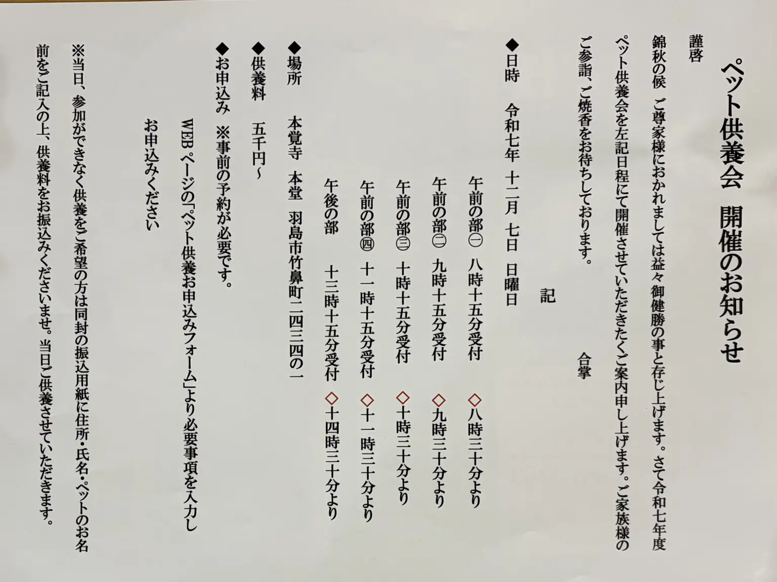 下記WEBページ[ペット供養お申込みフォーム]よりお申し込みください。
